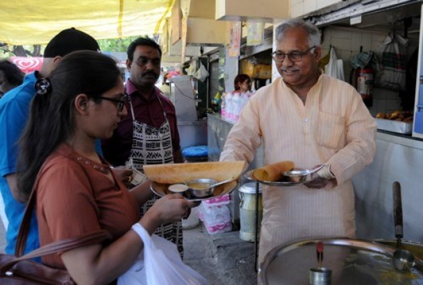 குட்டி ஒரு வாடிக்கையாளருக்கு தோசை பரிமாறுகிறார்.